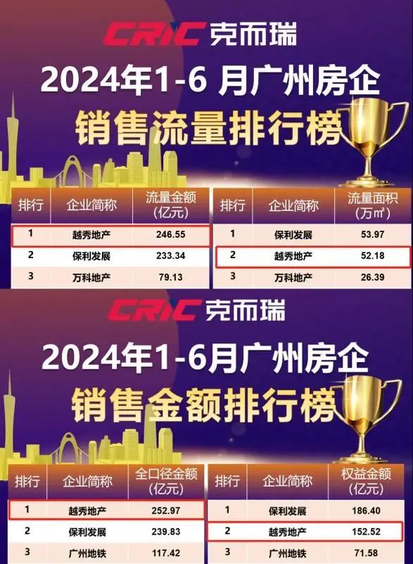 值得注意的是,在克而瑞最新发布的2024年上半年广州房企销售榜单中,越秀地产广州区域表现出色,全口径金额高达252.97亿元,流量金额246.55亿元,再次印证了其致力于打造“好产品”的理念,获得了购房者的高度认可。