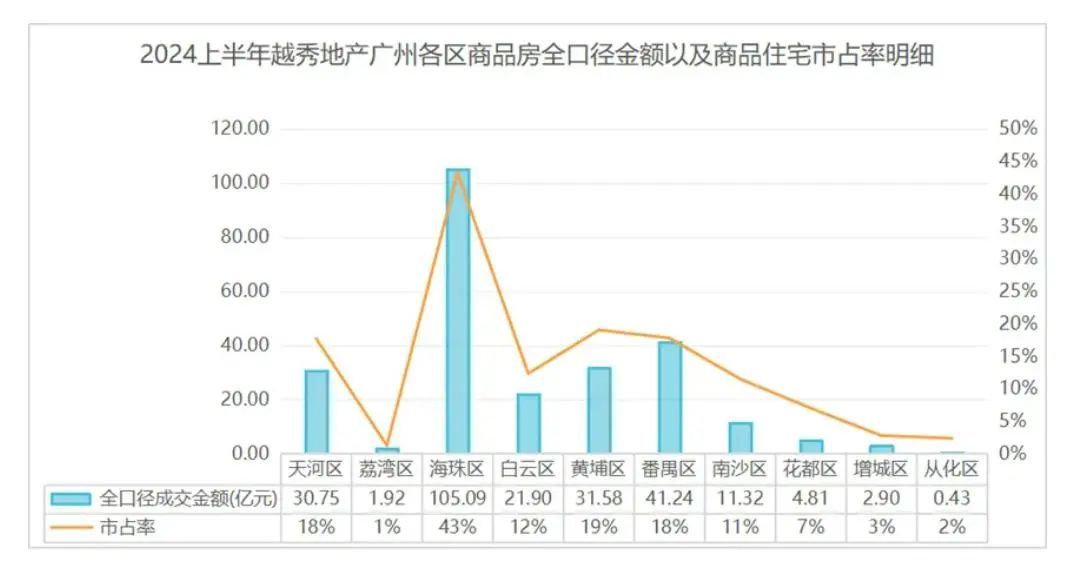 据克而瑞统计,今年上半年广州商品房网签项目中,越秀地产广州区域市占率为18%。