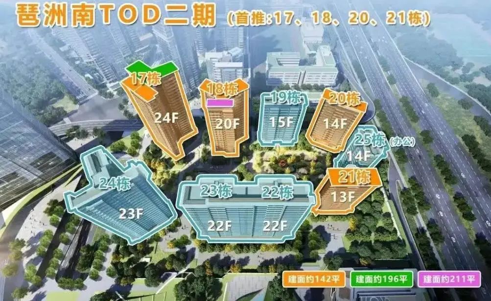以广州楼市的“门面”——琶洲南TOD二期为例,不仅延续了一期“CBD+TOD+POD开发模式”,二期更是在原有基础上进行了全系升级。在产品力上,二期住宅仅13-24层高,容积率仅有2.0,主力供应面积段为建筑面积142-280㎡,户型实用率更是再创新高。